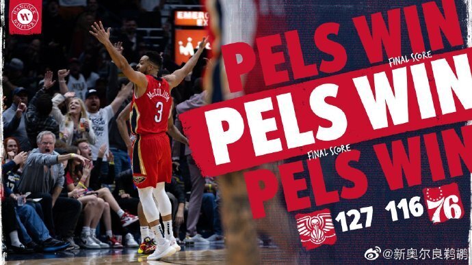 唯彩看球迅 NBA常规赛,新奥尔良鹈鹕队延续胜势。麦科勒姆投中11个三分球,狂砍42分和5次助攻,锡安得到36分和5个篮板,他们率队上半场确立优势后牢牢控制局势,鹈鹕队在主场以127-116战胜费城76人队,鹈鹕队拿到5连胜,76人队遭遇2连败。