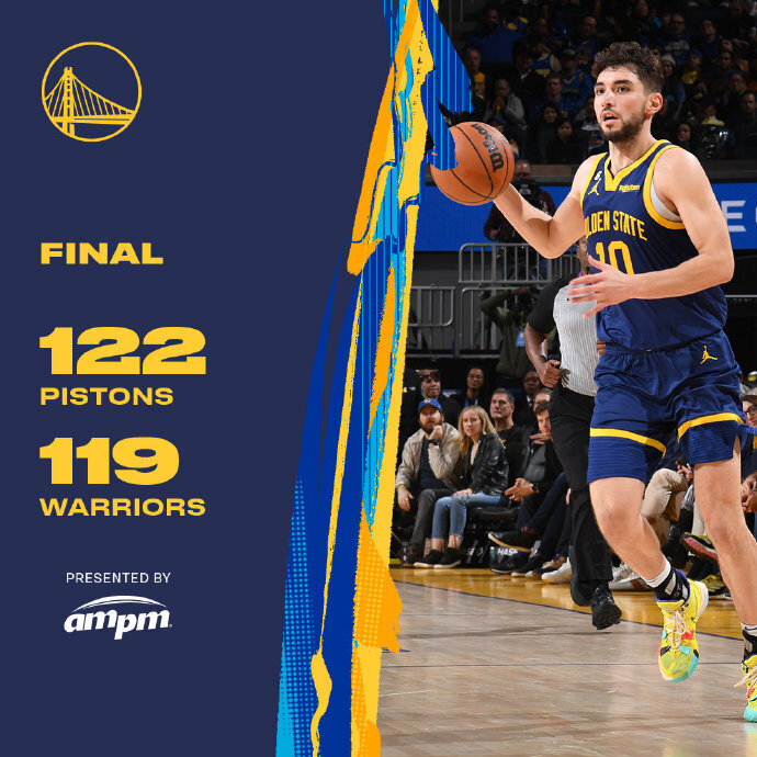 下半场,博格达诺维奇和斯图尔特联手6分,活塞队扩大领先。随着普尔和卢尼联手6分结束第三节,勇士队以88-91落后3分。末节,埃维和伯克斯联手7分,活塞领先6分。勇士队开启追分模式,但海耶斯和伯克斯再次将比分拉开。汤普森连拿8分将比分追至107-108。第四节还有4.2秒时活塞队以119-116领先。汤普森右翼三分命中,第四节还有2.3秒时勇士队追成119平。贝右翼三分命中绝杀,122-119,活塞队赢得胜利。