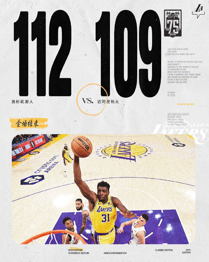 下半场,巴特勒和阿德巴约建立起联系,热火一度反超比分,但湖人顽强意志力总能咬住比分,双方展开胶着拉锯战,热火只有巴特勒和阿德巴约在状态,而湖人众将全民皆兵,后卫们联手布莱恩特总能给出回应,最后时刻湖人稍稍保持领先,奥拉迪波两罚一中,施罗德关键突破上篮基本杀死比赛,巴特勒绝平三分不中,最终湖人112-109险胜热火,拿到3连胜。