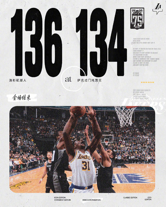 第三节,两队战成96平后,施罗德和威少联手得分,湖人队以103-99领先。萨博尼斯和莱尔斯连得7分,国王队领先。安德森和勒布朗轮流突破得手,三节战罢两队又战成109平。末节,布莱恩特独取6分,勒布朗也有3分,湖人队领先9分。福克斯发力带国王队追至124平。130平后,勒布朗篮下单打造成萨博尼斯六犯毕业,湖人队以133-132领先。第四节还有7.4秒时国王队追成134平。施罗德突破造成福克斯犯规,国王队提出挑战,裁判回看录像维持判罚。施罗德两罚全中,湖人队在还有3.6秒时以136-134领先。福克斯三分不中,国王队惜败。