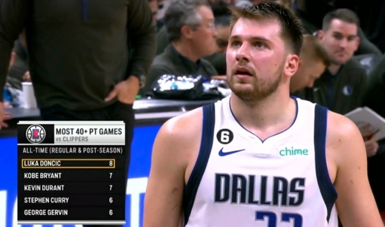 据转播方数据统计,这是东契奇生涯(常规赛+季后赛)第8次面对快船砍下40+,超越科比与杜兰特(7次),位居NBA历史第一。