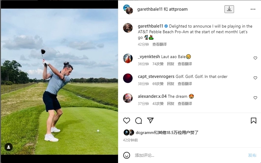 贝尔社媒写道:“很高兴跟大家宣布,我将在下月初开始参加圆石滩职业-业余配对赛,加油!”