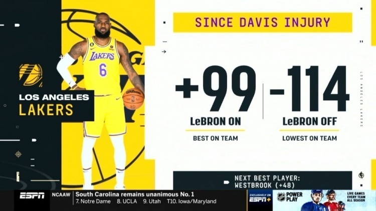 数据显示,在2022年12月17日浓眉受伤以来的比赛中,詹姆斯在场时湖人净胜99分(队内最高),而詹姆斯下场时湖人净负114分(队内最低)。