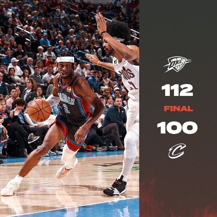 下半场,双方继续缠斗,比分咬得很紧,雷霆强攻内线频频得手,骑士内外开花保持微弱领先,末节骑士突然哑火,雷霆多点开花打出进攻高潮取得两位数优势,骑士苦苦追赶无果,亚历山大得分助攻一肩挑带队杀死比赛。最终,雷霆112-100击败骑士,主场过关。