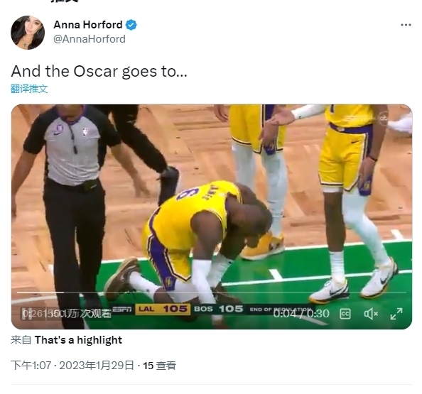 霍福德的妹妹发推:“奥斯卡奖的获得者是……”并配上了詹姆斯抱怨判罚,一度跪地的视频。