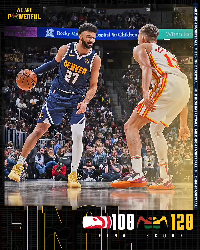 下半场,德章泰-穆雷又站出来,里突外投第三节砍下15分4助攻帮助老鹰追分,末节老鹰一度追到个位数分差,但约基奇又攻又传帮助掘金稳住局势,穆雷接连中远投重新拉开近20分分差,老鹰再无机会,最终掘金128-108战胜老鹰,拿到3连胜。