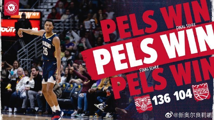 易边再战,国王依然没能打开进攻状态,鹈鹕延续场上优势,一举将分差拉开到30分。比赛很快来到第四节,两队交替得分,比赛很快失去悬念,进入垃圾时间,最终鹈鹕主场136-104大胜国王,取得两连胜。