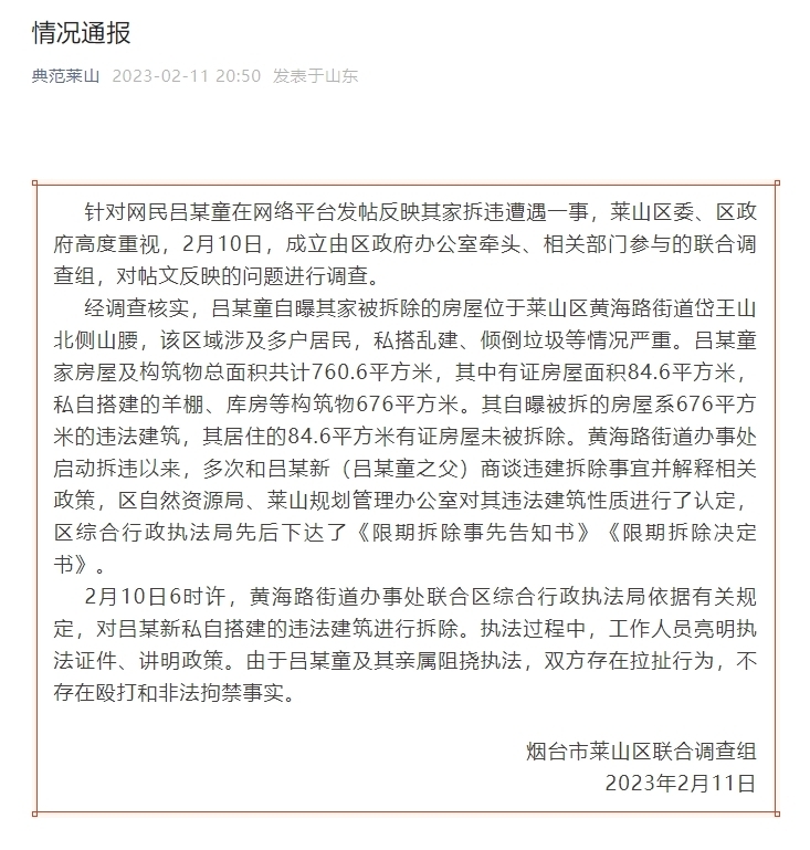 针对网民吕某童在网络平台发帖反映其家拆违遭遇一事,莱山区委、区政府高度重视,2月10日,成立由区政府办公室牵头、相关部门参与的联合调查组,对帖文反映的问题进行调查。