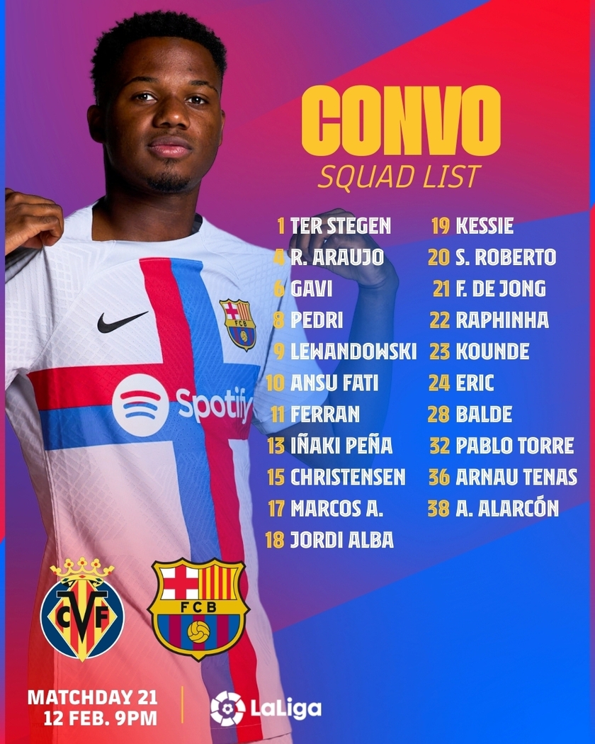 唯彩看球讯 北京时间2月13日周一凌晨4点,巴萨将在西甲第21轮客场挑战比利亚雷亚尔。今天,巴萨公布了比赛日大名单。
