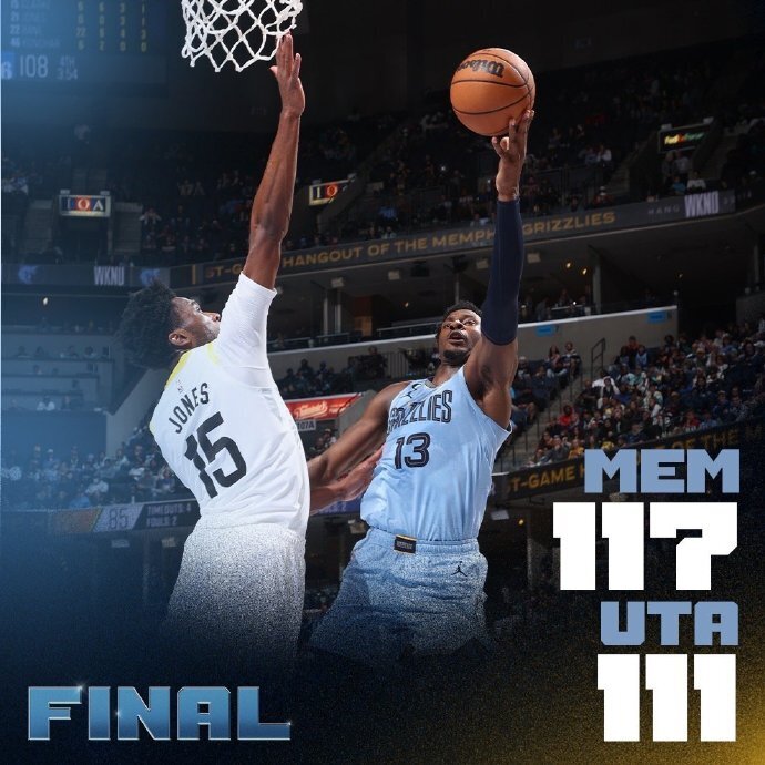 休息归来灰熊开局一直掌控着局面,然而第三节末段爵士突然发力送出11-3的攻势将分差缩小至个位数燃起希望,末节爵士一度追至3分看到逆转希望;不过灰熊及时回暖,莫兰特和狄龙接连命中两记三分带队打出10-1的攻势重新拉开两位数领先,爵士末段仍然没有放弃回敬10-0的攻势再次追至1分,不过最后手握扳平球权的他们却出现致命失误葬送良机。最终,灰熊主场击退爵士拿下比赛。