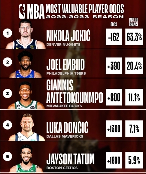 唯彩看球讯 近日,博彩公司更新了最新的MVP赔率,约基奇断档领先,具体排名如下: