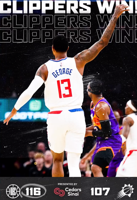 下半场,艾顿接连内线强打命中,太阳外线三分手感也回暖一度反超比分,但小卡终于破荒,曼恩里突外投单节上双帮助快船给出回应并重新取得领先,末节布克上来就连续失误,快船抓住机会将分差拉开至双位数,随后双方展开拉锯战,太阳追分总是差一点,最终快船116-107力克太阳,升至西部第四。