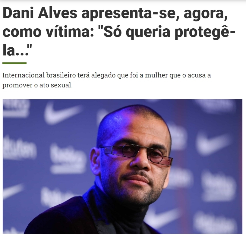 阿尔维斯说自己当时正在厕所,然后那名女士未经过他的同意走了进来,并对自己进行了口X,所以自己才是性侵犯的受害者。球员补充道:“她直接向我走来,我没有碰那个女孩”。但这其实与警方搜集到的DNA样本以及监控证据相悖。