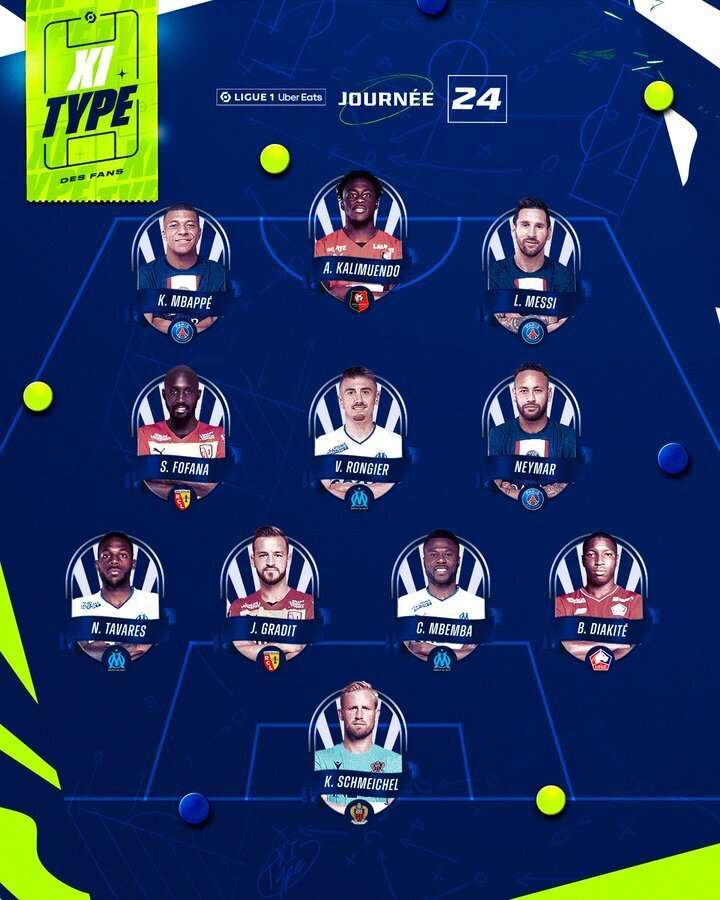 中场:S-福法纳(朗斯)、隆吉尔(马赛)、内马尔(巴黎)