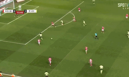 第7分钟,马赫雷斯右路接队友横向转移后回传,德布劳内接球直塞禁区右侧,马赫雷斯插上横敲,福登后点包抄小角度左脚推射破门,曼城领先,1-0!