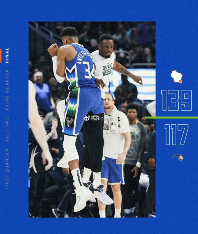 下半场回来,魔术进攻陷入停滞,而雄鹿则延续火力愈战愈勇,字母哥连投带罚率队始终占优,三节结束后雄鹿继续领先12分,末节上来,魔术进攻滞涩追分无望,双方分差越拉越大,比赛提前失去悬念,两队也接连换上替补阵容,最终雄鹿139-117大胜对手豪取16连胜。