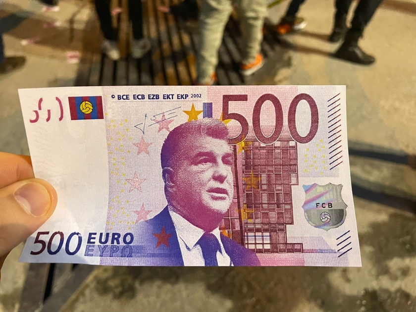 现场有球迷高呼关于拉波尔塔的口号,还有写着“联盟腐败”的旗帜,以及印有拉波尔塔图像、巴萨队徽的500欧元的“钞票”。
