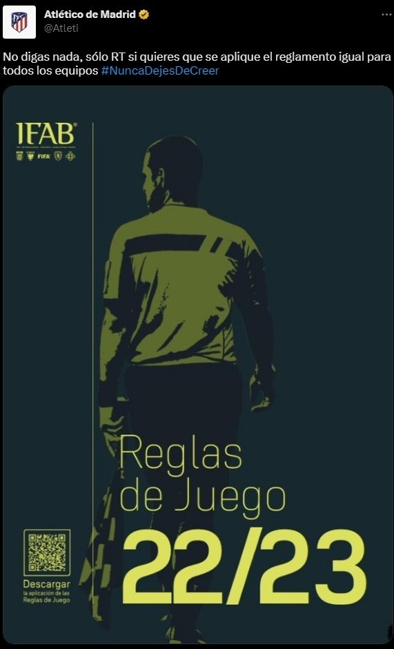 马竞官推晒出IFAB的2022-23足球比赛规则,并写道:“什么也不要说,如果你希望规则平等地适用于所有球队,那请转发。#永远不要停止相信”