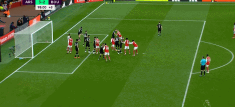 第86分钟,萨卡远射被封堵,厄德高补射踢高。第97分钟,伯恩茅斯解围角球,内尔森停球抽射破门,3-2,阿森纳神奇逆转。