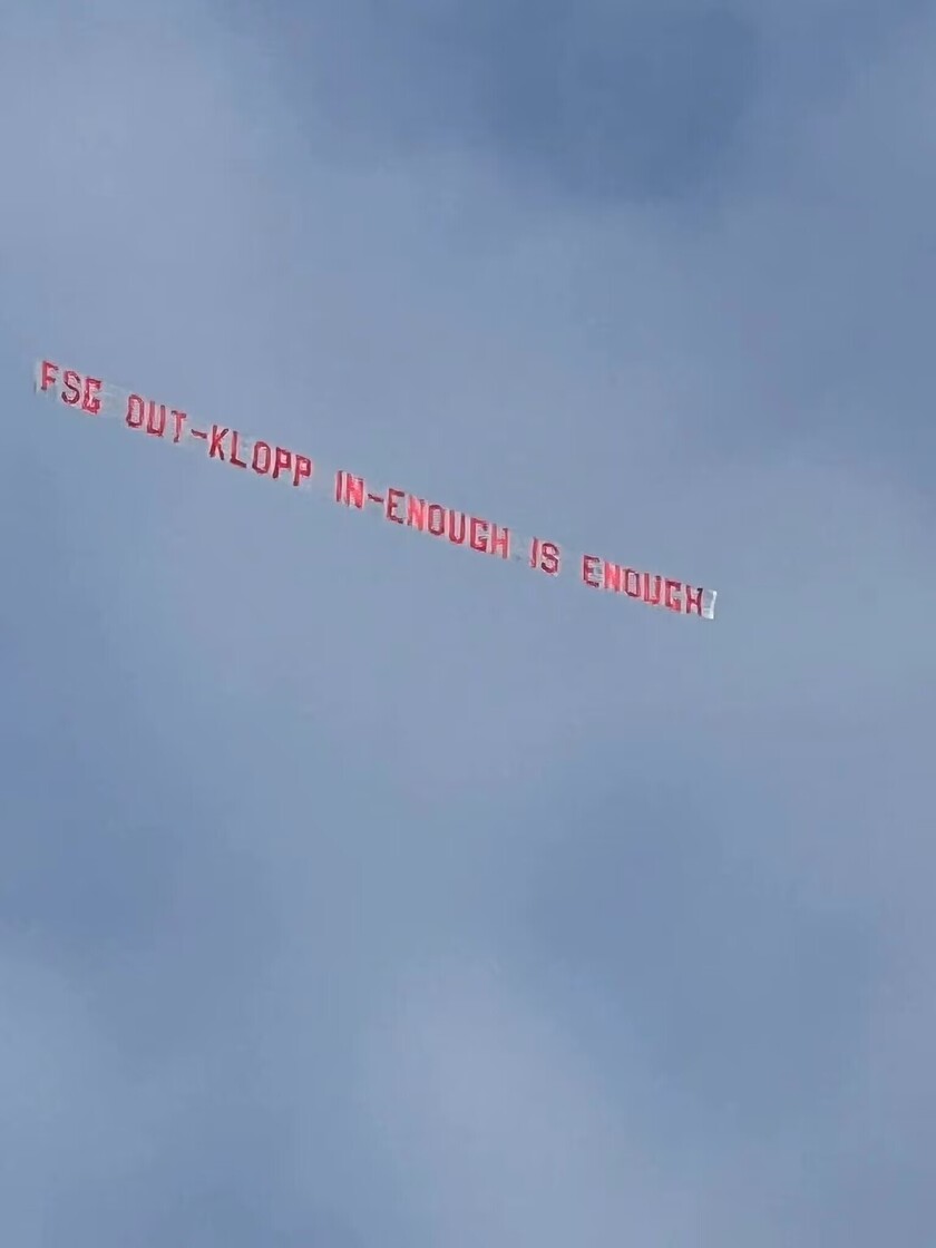 比赛中,有记者拍到红军球迷用飞机拉出的横幅,上面写道:芬威滚蛋,克洛普留下,我们已经受够了!