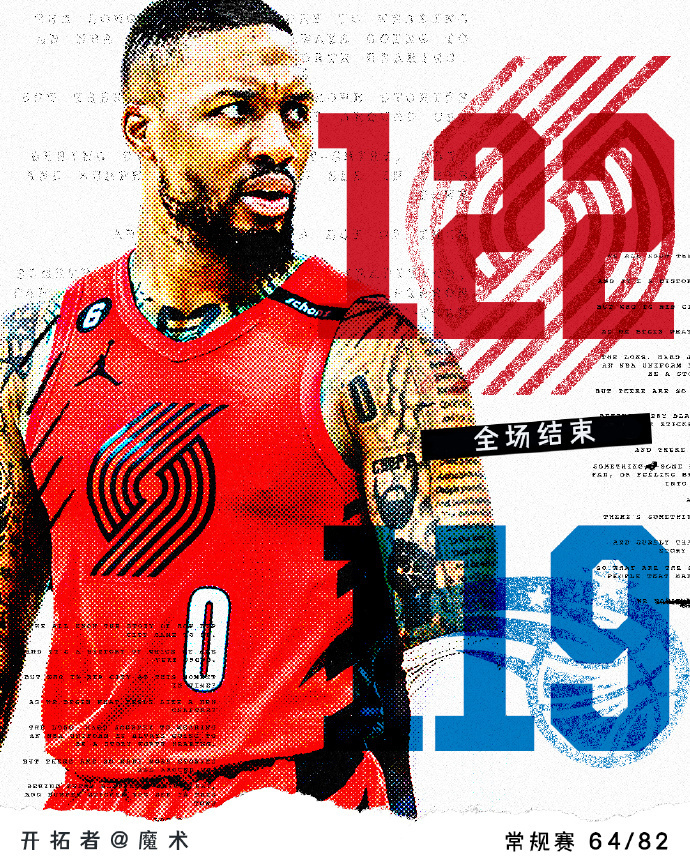 开拓者(30-34):利拉德41分9板6助2断,格兰特20分6板7助2帽,尤班克斯13分6板3助,雷迪什16分5板3助2断,塞布尔6分8板,沃特福德7分5板2断,夏普8分。