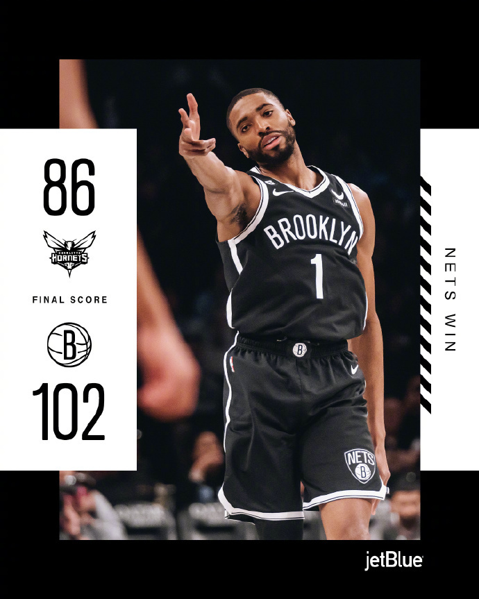 下半场,篮网继续发力一度领先到近40分,但黄蜂众将手感终于回暖连续追分,缩小至20分分差,末节布里奇斯手感下降,黄蜂抓住机会追到20分以内,但无奈时间所剩无几,最终篮网102-86轻取黄蜂。