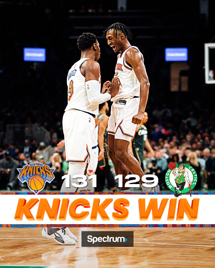 下半场回来,兰德尔联手奎克利不断追分,尼克斯稳扎稳打蚕食分差,兰德尔飚中压哨三分,三节结束后尼克斯反超1分,末节决战,尼克斯开局一波12-2确立优势,凯尔特人迅速回敬13-2抹平分差,决胜时刻尼克斯内外开花再度确立7分优势,但绿军连中三分拉回悬念,布朗2+1绝平后上演抢断,双方战平进入加时,首个加时,霍福德飚中大心脏三分,奎克利抛投绝平,塔图姆绝杀不中后比赛继续加时,奎克利里突外投连得7分,塔图姆连突带投保留悬念,霍福德绝杀三分不中,最终尼克斯131-129险胜对手豪取九连胜。