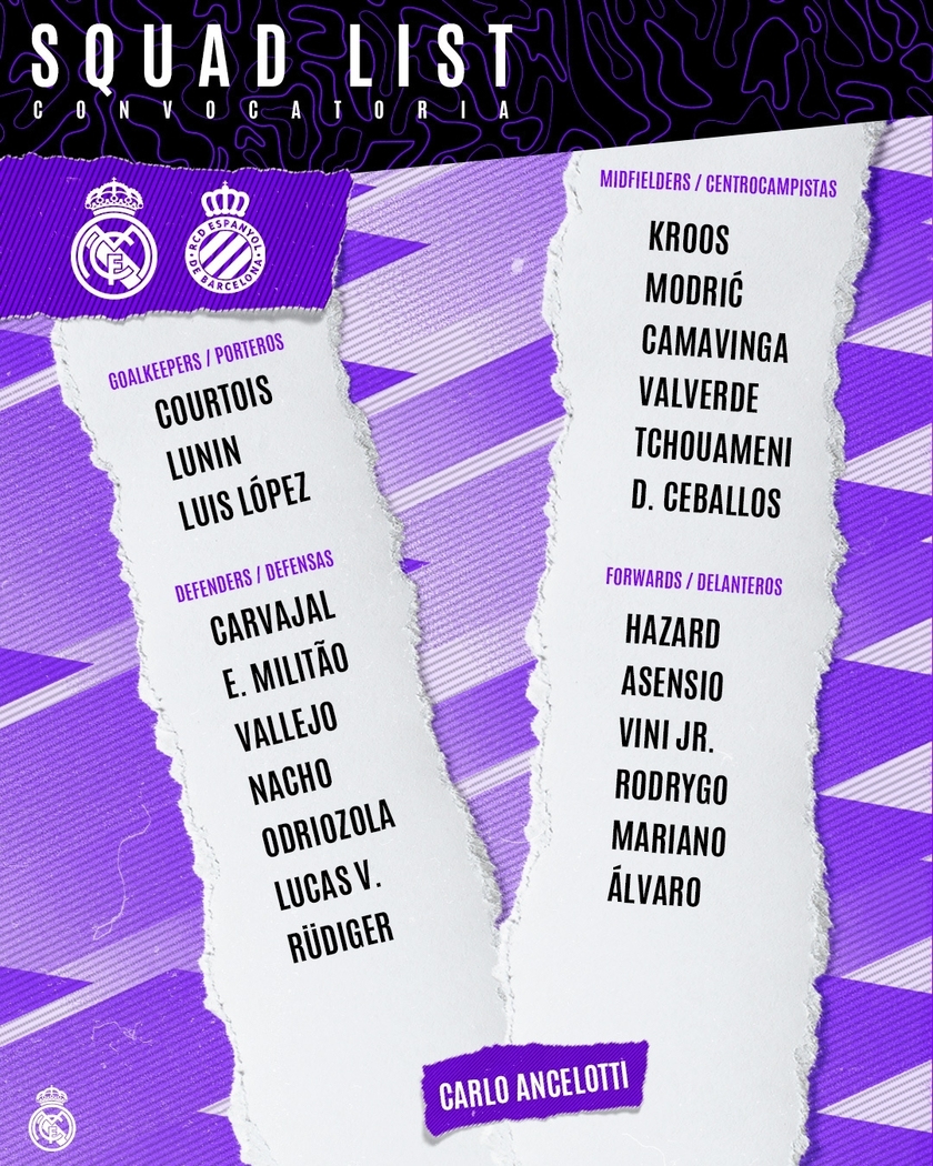 唯彩看球讯 北京时间3月11日21点,西甲第25轮,皇马将在主场对阵西班牙人。皇马官网公布了比赛大名单,本泽马、阿拉巴等人缺席,莫德里奇、维尼修斯领衔。