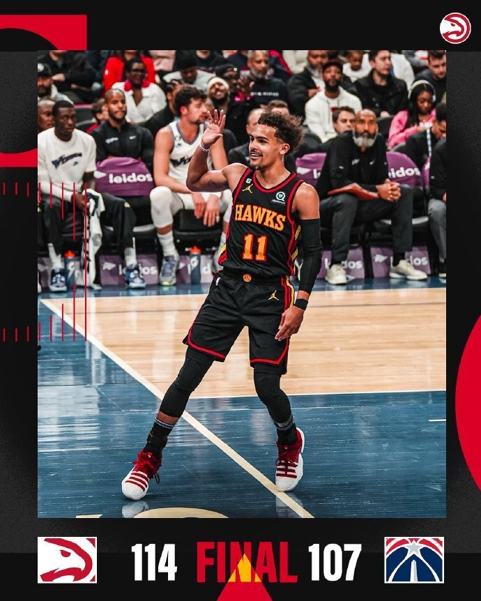 下半场,双方继续拉锯战,波津和比尔接连中远投帮助奇才一度反超比分,但老鹰替补接连3记三分回应一波10-0还是领先到双位数,末节老鹰替补继续发挥守住双位数领先,比尔和库兹马联手发力帮助奇才咬住比分并保持住比赛悬念,但特雷-杨超远三分稳住局势,但接连的失误让奇才再次寻得机会,可惜比尔上篮不中,最终老鹰114-107再胜奇才。