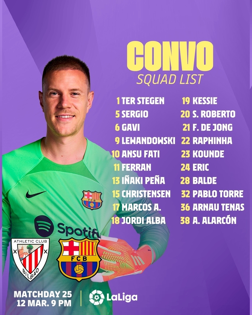 唯彩看球讯 北京时间3月13日凌晨,巴萨将在西甲第25轮比赛中客场对阵毕尔巴鄂,巴萨公布了此役的球员名单,莱万伤愈复出,登贝莱、佩德里继续因伤缺席,阿劳霍则遭遇停赛。