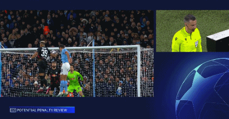 第20分钟,曼城角球开至禁区,罗德里头球争顶,皮球打在亨里希斯的手臂上,裁判观看VAR后判罚点球。