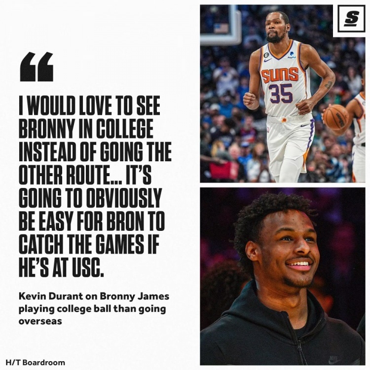 杜兰特表示:“现在在大学里有很多惊人的天赋,但对于球员来讲还有很多的途径,去海外打球,去澳大利亚打球,这些都很酷。但我还是感觉去大学会更好。那里有很大的舞台,你能够展示出自己。我很想看到布朗尼去上大学,而不是走另外一条途径。我想看他打球,在真实的世界里,跟随他的旅程。我猜他会去南加州大,我觉得他在南加州大能够轻松匹配上那里的比赛强度。”