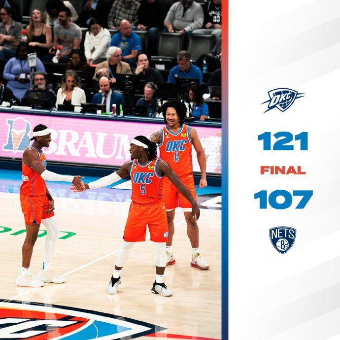 易边再战,场上形势风云突变,雷霆外线连续投中,篮网则运动战连连失准,雷霆单节打出38-20,逐渐反超并领先到8分进入第四节。末节上来,雷霆稳扎稳打维持差距,篮网没能再追上比分,最终雷霆121-107逆转战胜篮网,取得三连胜。
