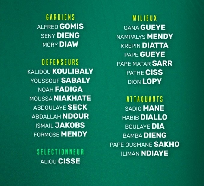前锋:马内(拜仁)、迪亚洛(斯特拉斯堡)、迪亚(萨勒尼塔纳)、巴姆巴-迪昂(洛里昂)、帕佩-萨科(博洛尼亚)、恩迪亚耶(谢菲联)