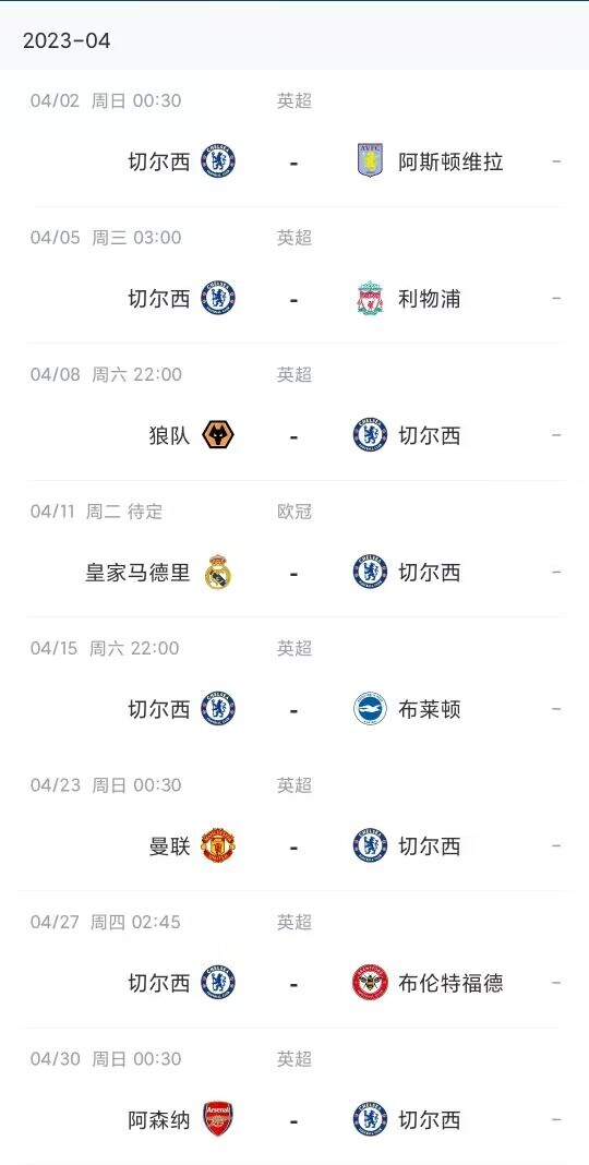 据目前赛程,切尔西将切尔西将在4月有9场比赛要踢。