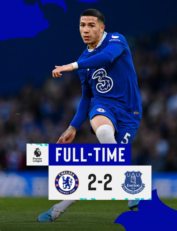 全场比赛结束,切尔西2-2战平埃弗顿。