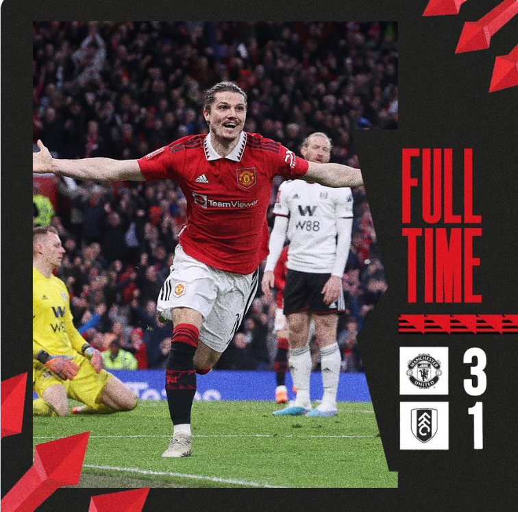 唯彩看球讯北京时间3月20日(周一)凌晨00点30分(英格兰当地时间3月19日16点30分),2022-23赛季英格兰足总杯进行了1/4决赛最后一场比赛,曼联在老特拉福德球场迎战富勒姆。曼联3-1逆转富勒姆晋级4强,富勒姆米特罗维奇率先破门,随后曼联桑乔制造点球并导致威廉、米特罗维奇和富勒姆主教练马尔科-席尔瓦被罚下,B费打入点球且打入曼联第3球,萨比策打入在曼联的首个进球。
