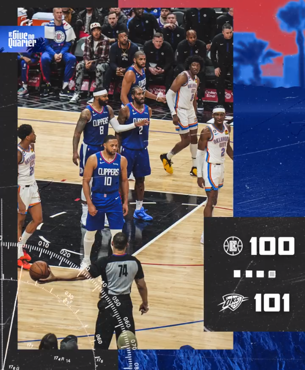 易边再战,快船很快追上并反超比分,此后两队交替领先,比赛很快来到第四节。末节回来,两队再次陷入拉锯战,依旧是交替取分,终场前四分钟乔治受伤退场,雷霆抓住机会取得领先,最后时刻小卡绝杀失败,雷霆101-100险胜快船。