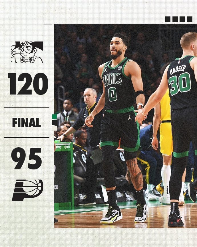 下半场,双探花联手带队重获两位数领先,步行者轮番冲击篮筐努力追赶,凯尔特人连续命中三分将分差拉开到20分以上,步行者大势已去无力回天。最终,凯尔特人120-95击败步行者,主场过关。