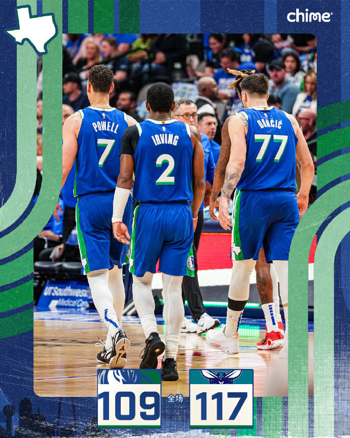 下半场,独行侠内线孱弱被黄蜂接连攻击一波12-1一度拉开20分以上,但东契奇里突外投依靠三分再次打出18-5攻击波追到个位数分差,末节独行侠一度追到差1分,但黄蜂通过三分再次稳住双位数领先,小丹尼斯-史密斯三分杀死比赛,最终黄蜂拒绝逆转,117-109送独行侠3连败。