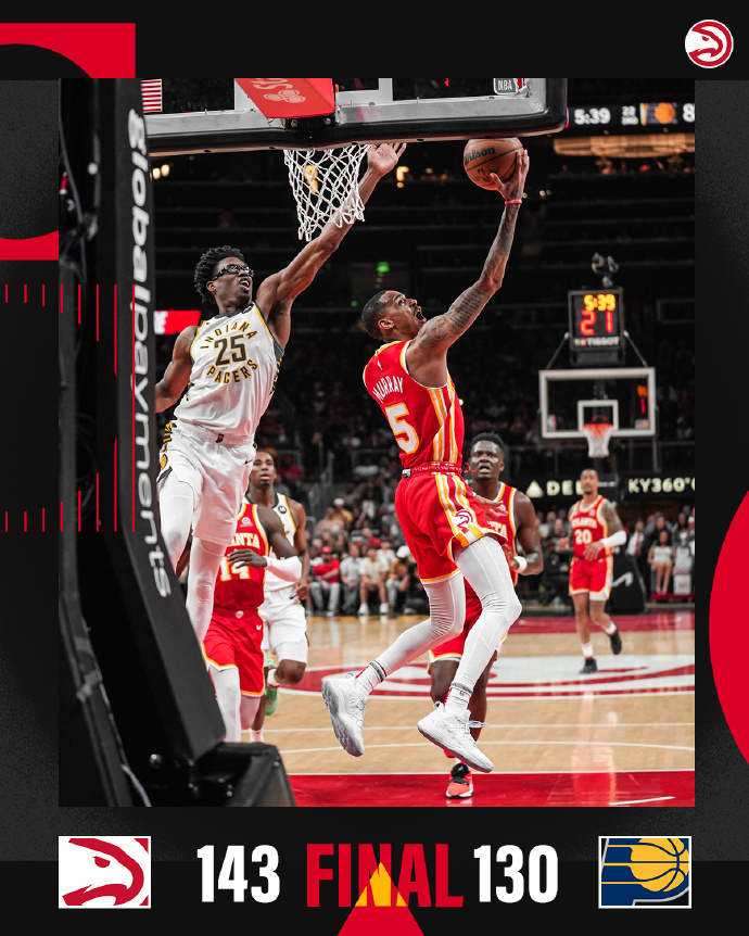 老鹰(37-37):特雷-杨14分3板5助遭逐,科林斯21分2板3助,卡佩拉17分17板,穆雷20分12助2断,萨迪克-贝18分6板,格里芬11分3助,奥孔武12分6板3助3断,马修斯14分,博格达诺维奇9分4板,霍勒迪7分