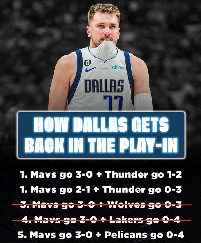 据美记Dalton Trigg分析,在湖人和森林狼今日都赢球后,独行侠晋级附加赛的可能方式只剩下三种,分别为: