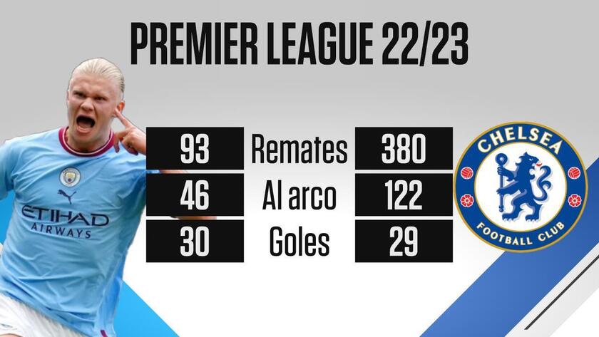 ESPN对比了一组本赛季哈兰德与切尔西的射门数据,哈兰德93脚射门46脚射正打入30球,而切尔西380脚射门122脚射正仅打入29球。
