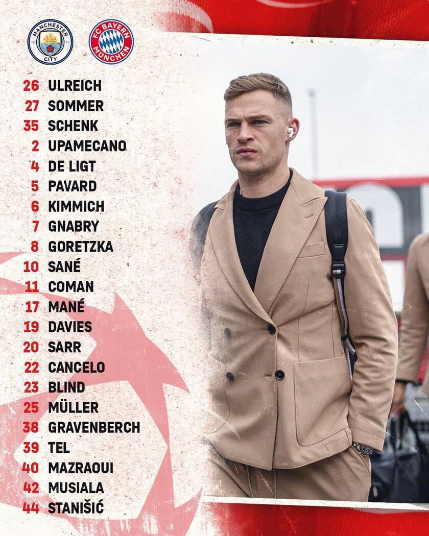 唯彩看球讯 拜仁官方公布欧冠客战曼城名单,坎塞洛、萨内战旧主,马内、穆西亚拉在列,拜仁此前发布公告,前锋舒波-莫廷因膝关节伤势缺席战曼城首回合比赛。