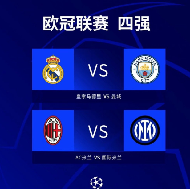 欧冠半决赛两回合将在北京时间5月10日、11日和5月17日、18日进行,皇马先主后客战曼城,国米先主后客战米兰。决赛6月11号在伊斯坦布尔的阿塔图尔克奥林匹克体育场举行。