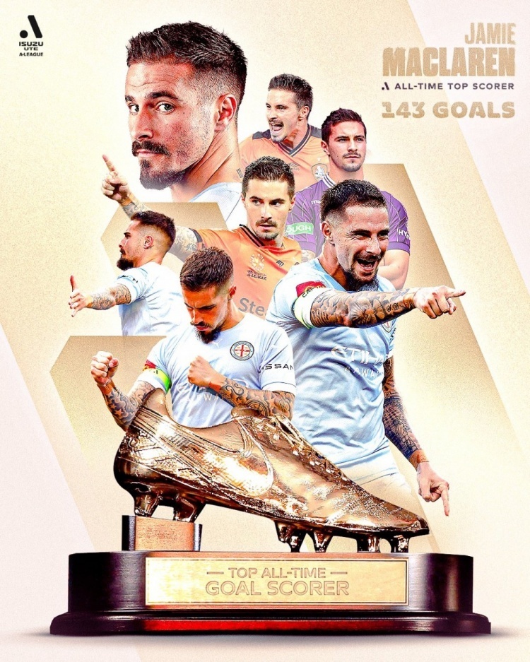 在墨尔本城本轮3-1击败西部联的比赛中,麦克拉伦上演帽子戏法,他在澳超的总进球数达到143粒,超越贝萨尔特-贝里沙,加冕澳超历史射手王。