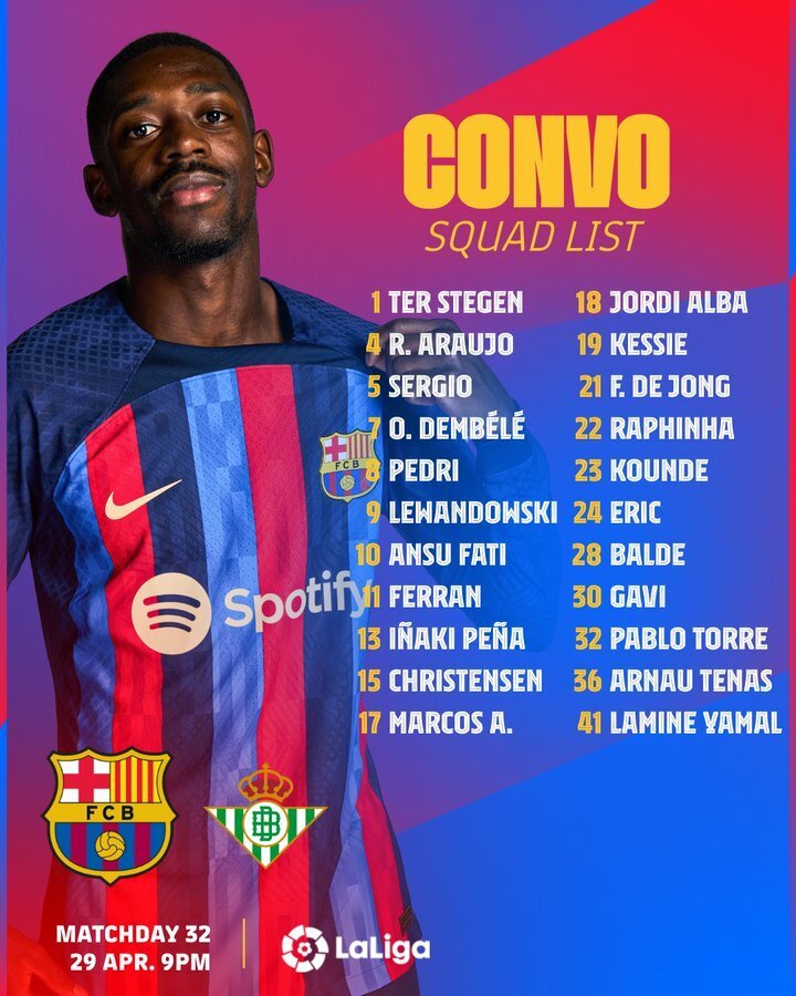 唯彩看球讯 北京时间4月30日周日凌晨3点,巴萨将在西甲第32轮主场迎战贝蒂斯,今天巴萨公布了比赛日大名单。