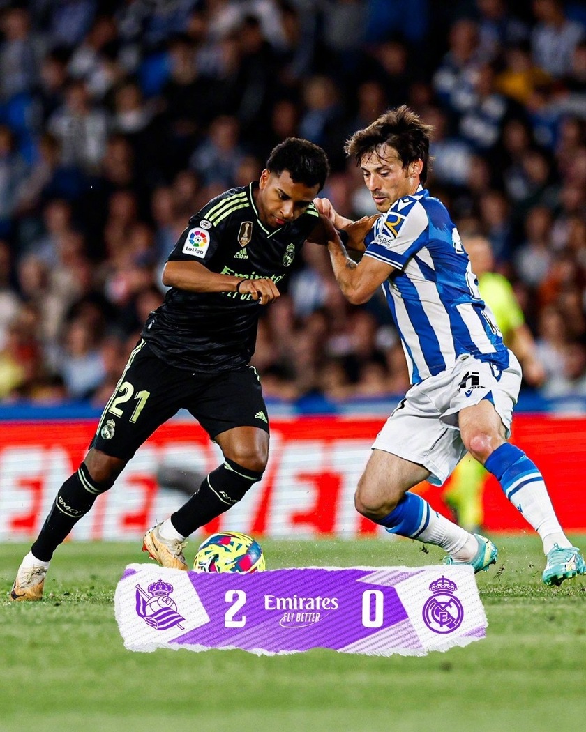 全场比赛结束,皇马客场0-2负于皇家社会。