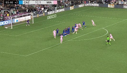 补时第4分钟,迈阿密国际绝杀,梅西任意球射门得分,2-1!