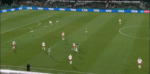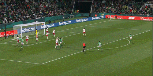 比赛第4分钟,爱尔兰女足通过角球机会由队长凯蒂·麦凯布直接破门得分,这也是爱尔兰队史在女足世界杯的首粒进球。